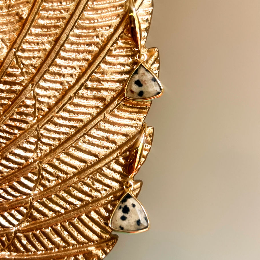 These classic gemstone triangle drops feature multi-coloured Dalmation Jasper.