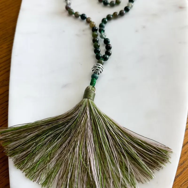 This handmade Mala of 108  features stunning dark Green Agate and emerald crystals. Green Agate Green Agate is a precious stone that balances the aura by eliminating negative energies or turning them into positive ones. This Green agate is a stone with cognitive & spiritual benefits. This agate stone makes the mind relaxed and precise, as well as boosts the decision-making.  Although This stone has a balancing characteristic for all chakras, it is most sufficient for the heart chakra with its green color. Balancing and benefits for insomnia and increasing cognitive and capacity for logical thinking.