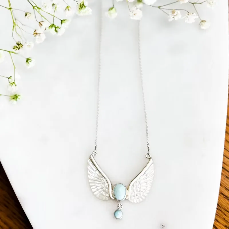 This necklace features delicately carved white shell wings, evoking a sense of freedom and grace. The luminous shell wings uplift either side of an oval Larimar and droplet, reflecting light beautifully, giving the necklace a subtle shimmer.